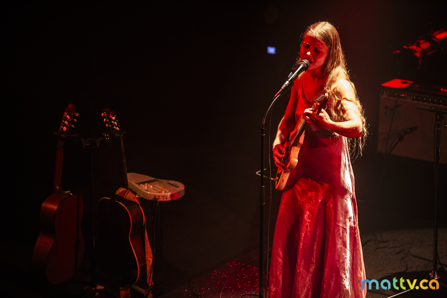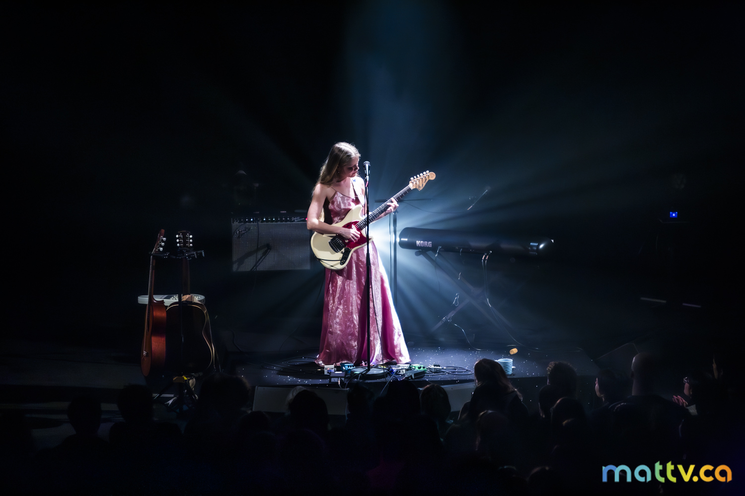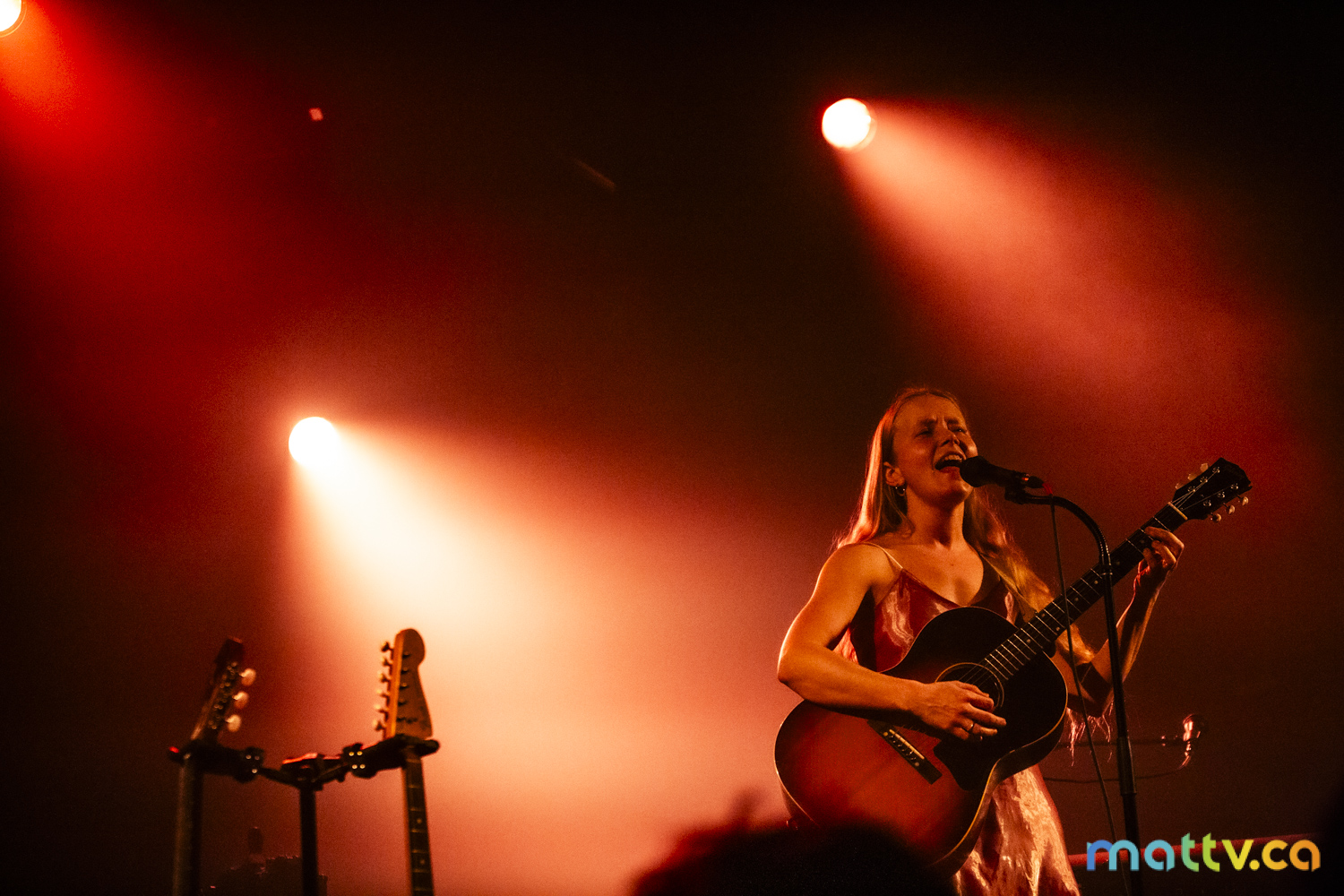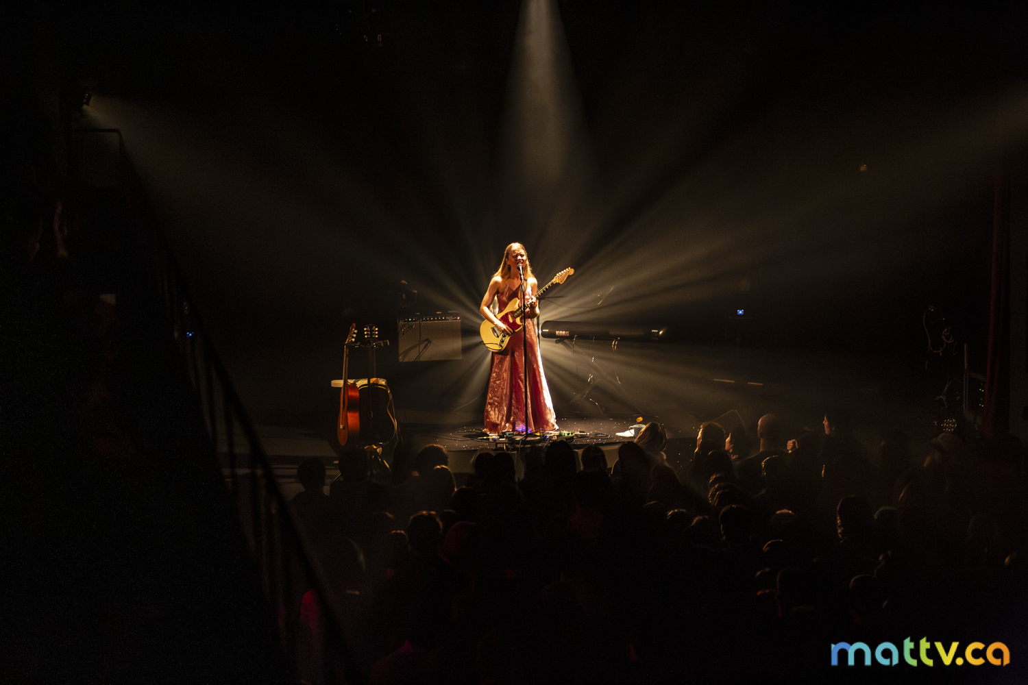 Dans la salle complète du Club Soda, le public l’admire avec des yeux amoureux. Elle entre sur scène, en silence, et installe rapidement une ambiance magique. Comme une fée, elle joue d’un air onirique, éraflant sa guitare qui accompagne ses mots, se présentant à nous comme une grande oratrice dans son style indie folk et alternatif.