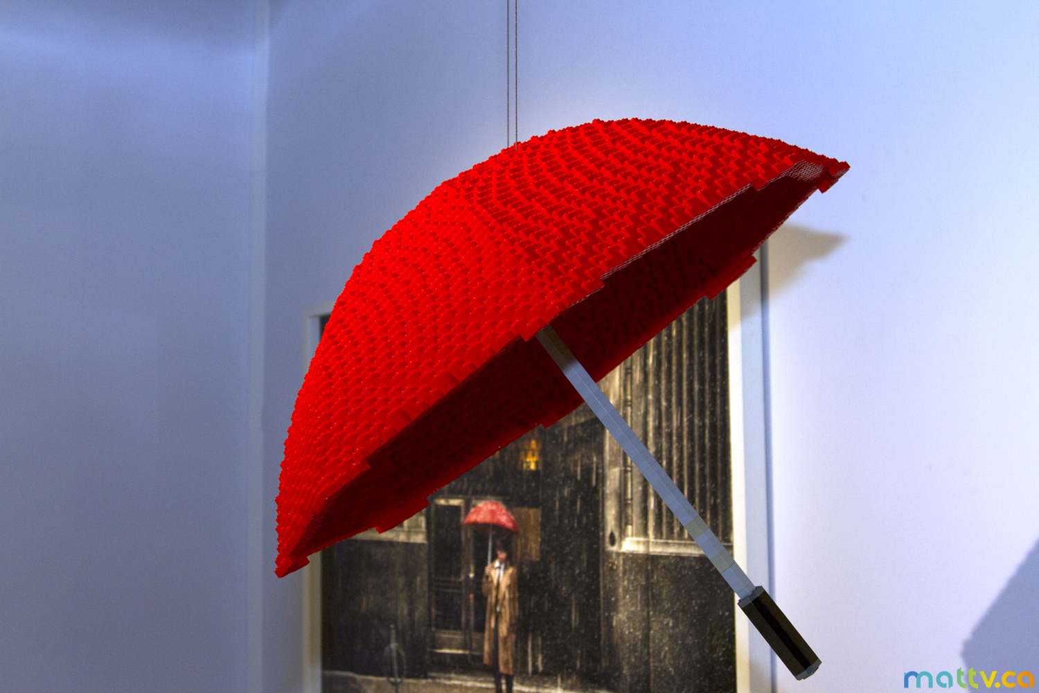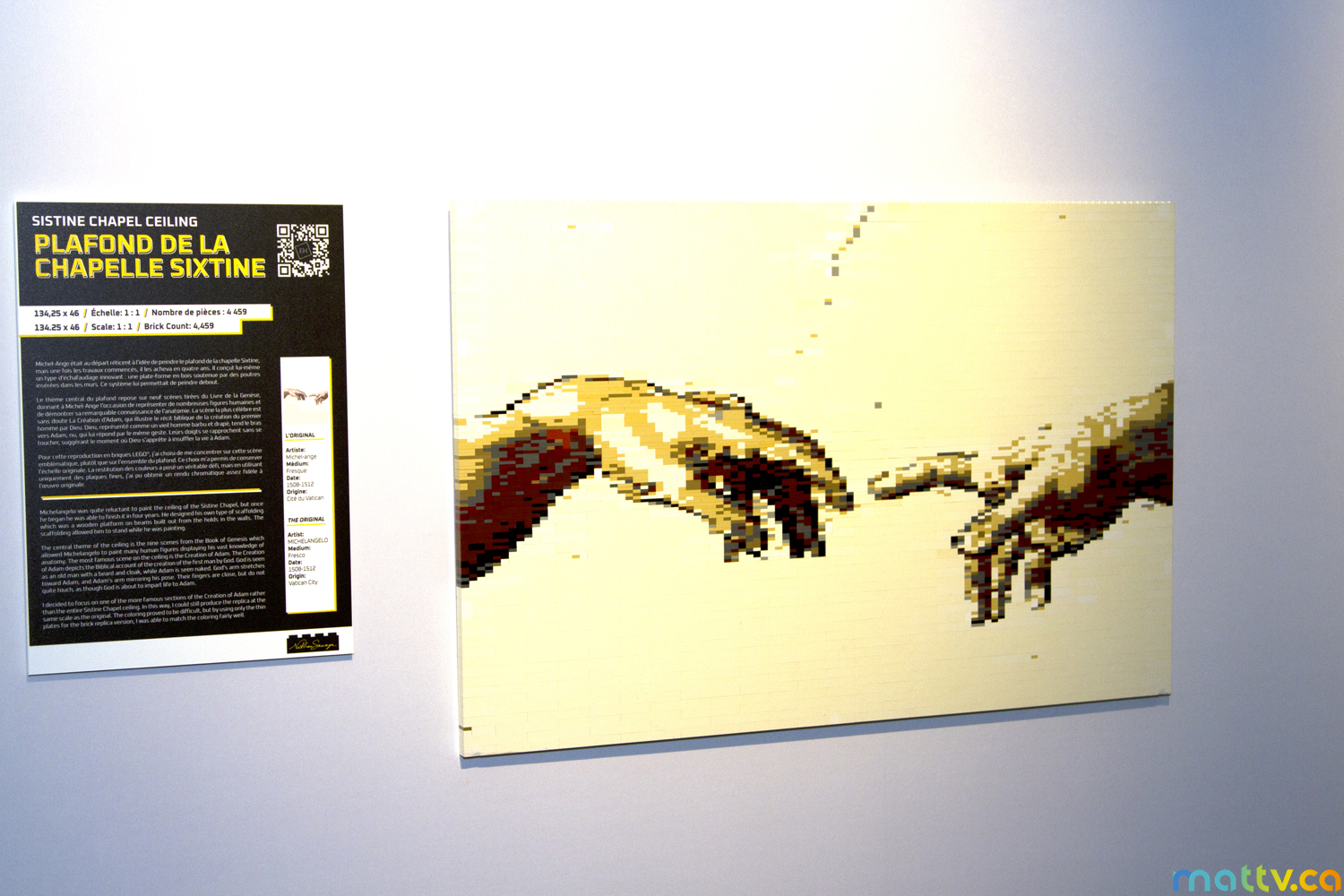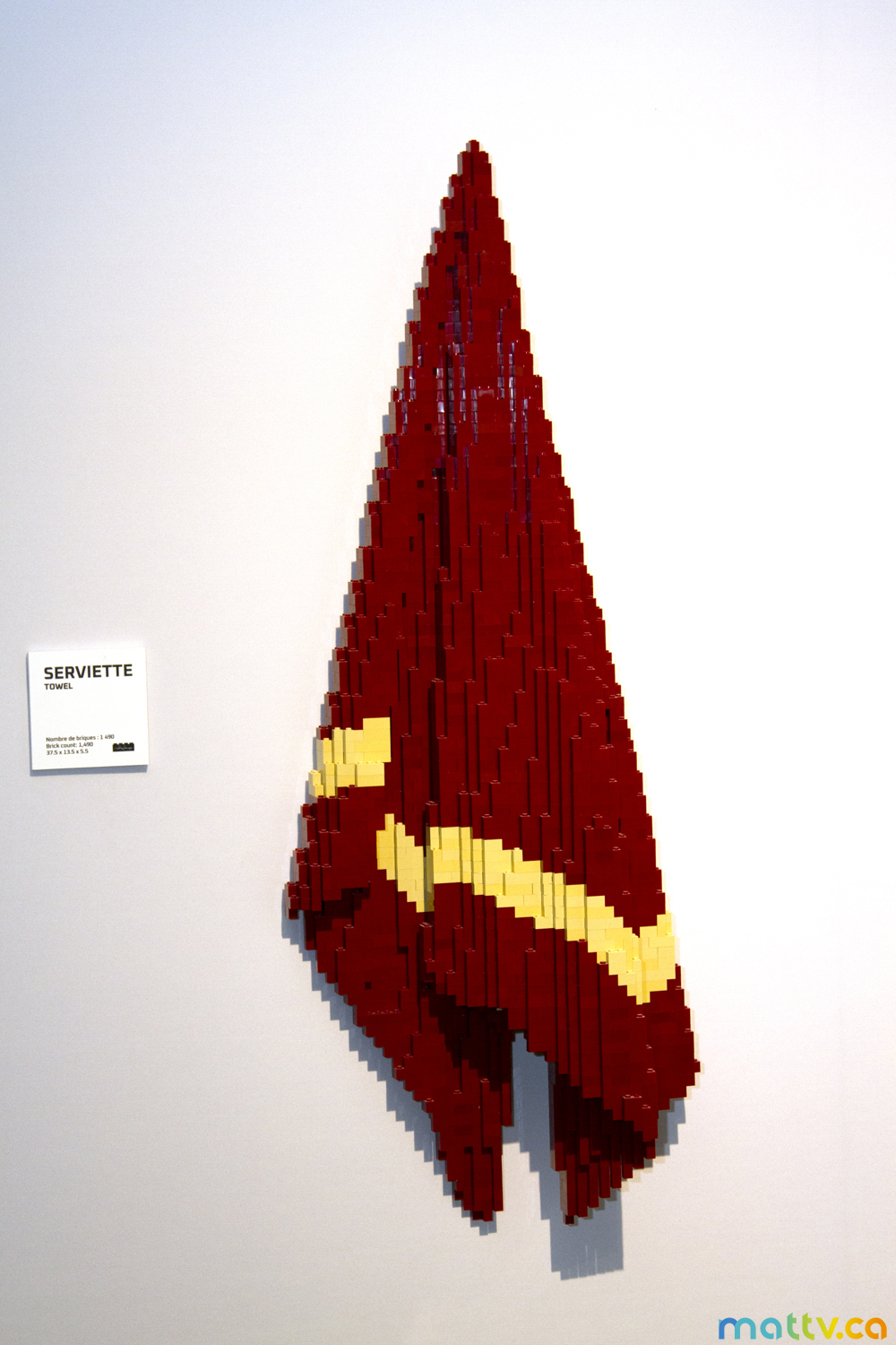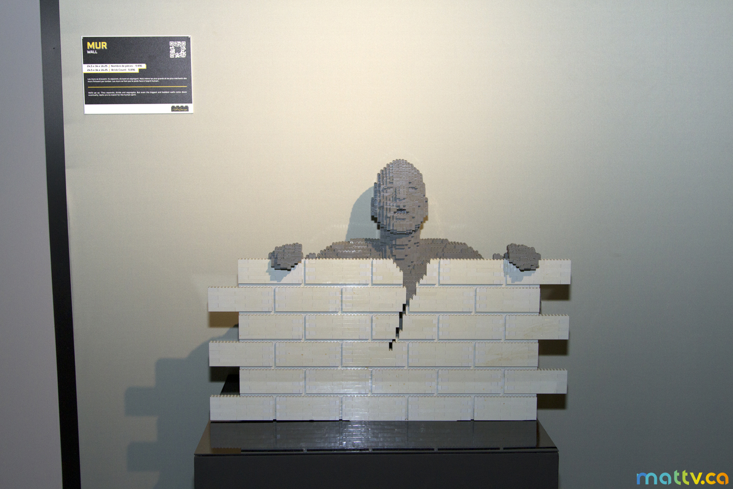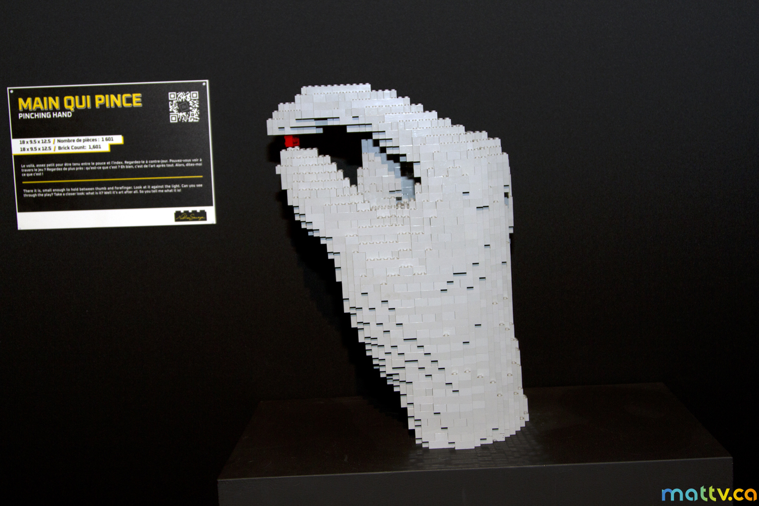 La visite débute dans une petite salle où joue en rafale une petite vidéo de Nathan expliquant ses débuts et d’où provient son inspiration. Et c’est aussi dans cette petite pièce que l’on observe notre première sculpture : une main grise qui pince une petite brique rouge. La visite n’est pas guidée par une trame audio expliquant chacune des œuvres. Chaque création a une fiche qui indique la dimension, le nombre de briques utilisées pour sa création et une courte description. Elle comporte aussi un code QR. Puisqu’il n’y a pas de temps alloué pour faire le tour, il est possible de revenir en arrière regarder une création qui nous a marqué.
