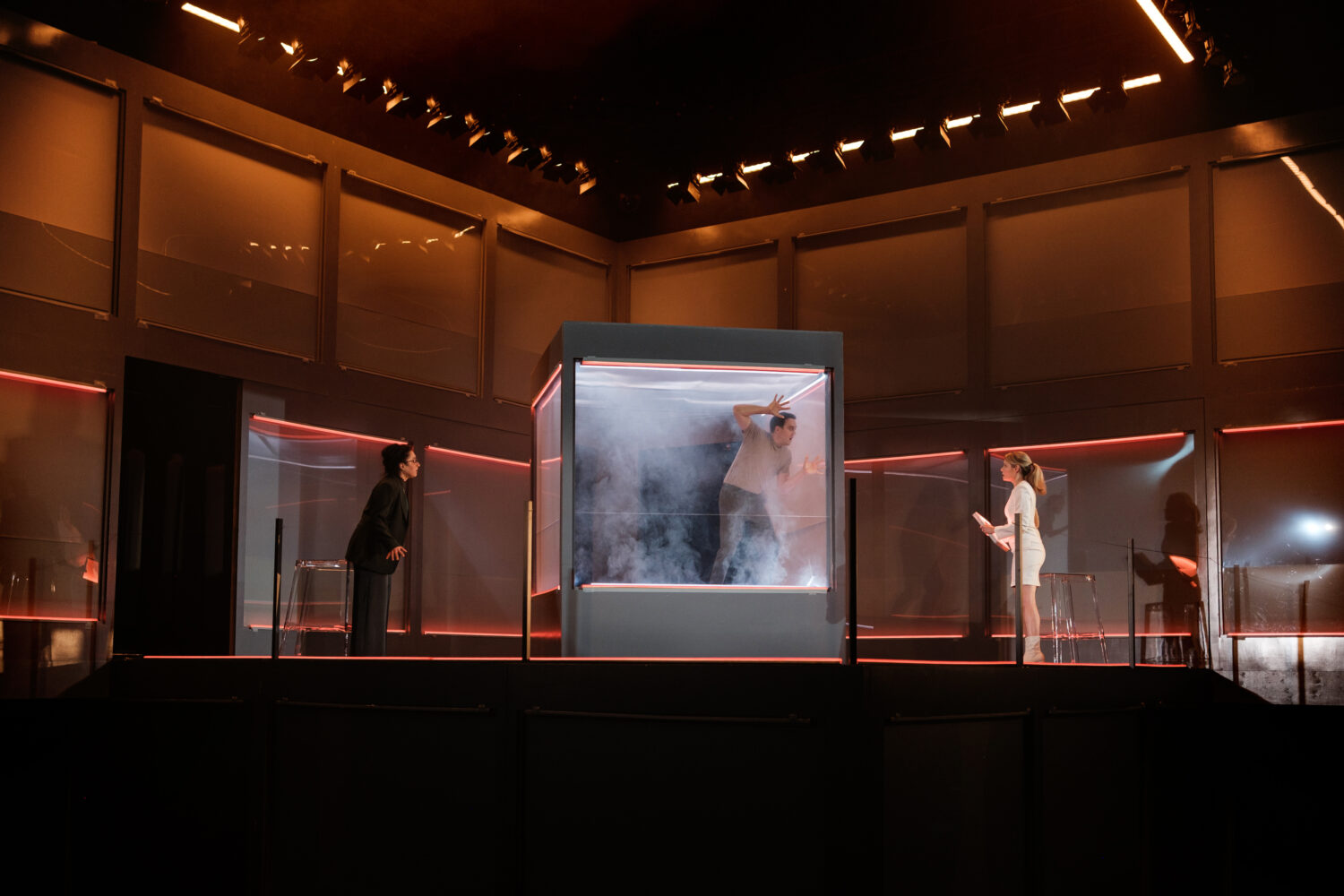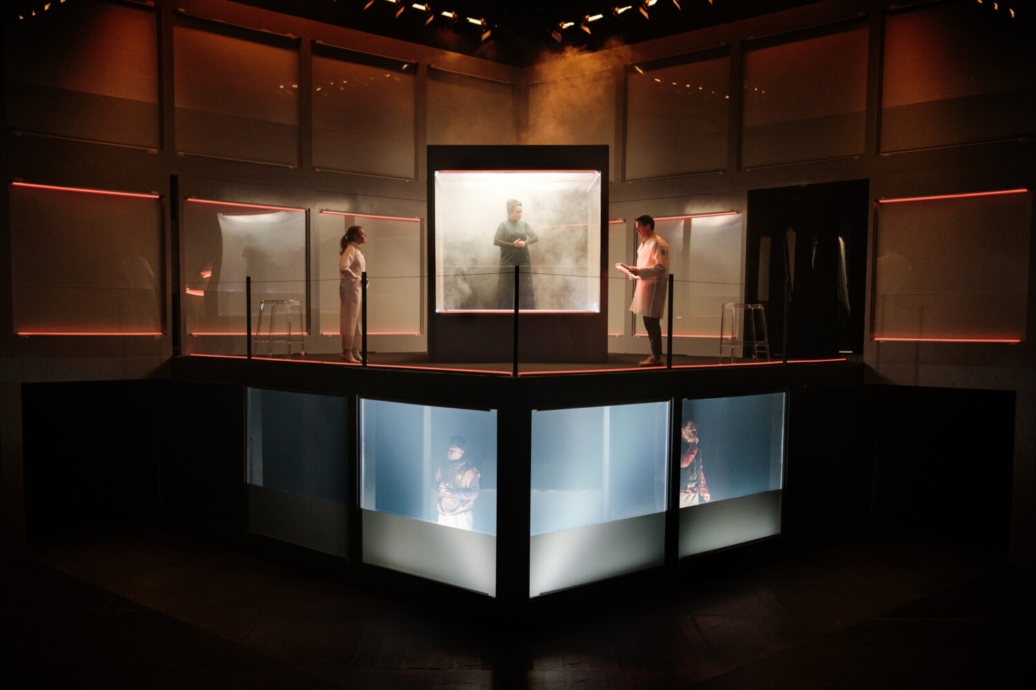Dans la pièce, l’adjonction de ces deux techniques dans une boîte de verre à l’intérieur de laquelle les sujets consentent à subir une modification, doit rendre les gens plus efficaces, leur permettant de faire de meilleurs choix.
