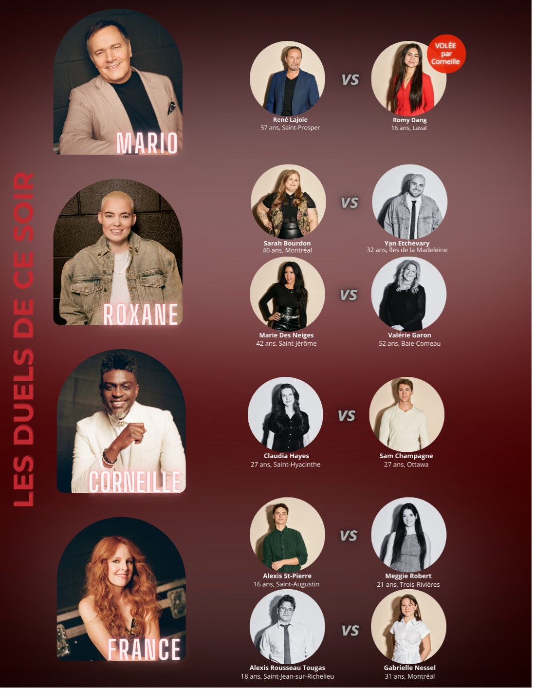L’étape des duels, deuxième phase de La Voix, a débuté cette semaine avec sa première ronde. Il s’agit d’une étape toujours difficile, où deux candidats de la même équipe s’affrontent dans un duel musical. Après chaque chanson, les coachs doivent décider avec lequel ils souhaitent continuer l’aventure. Heureusement, chaque coach a l’option de voler un candidat d’une autre équipe. Bref, comme le dit Roxane Bruneau : « C’est épouvantable les duels, c’est mettre la hache dans la moitié de ton équipe. »