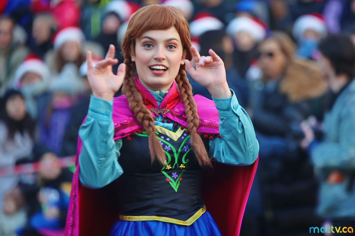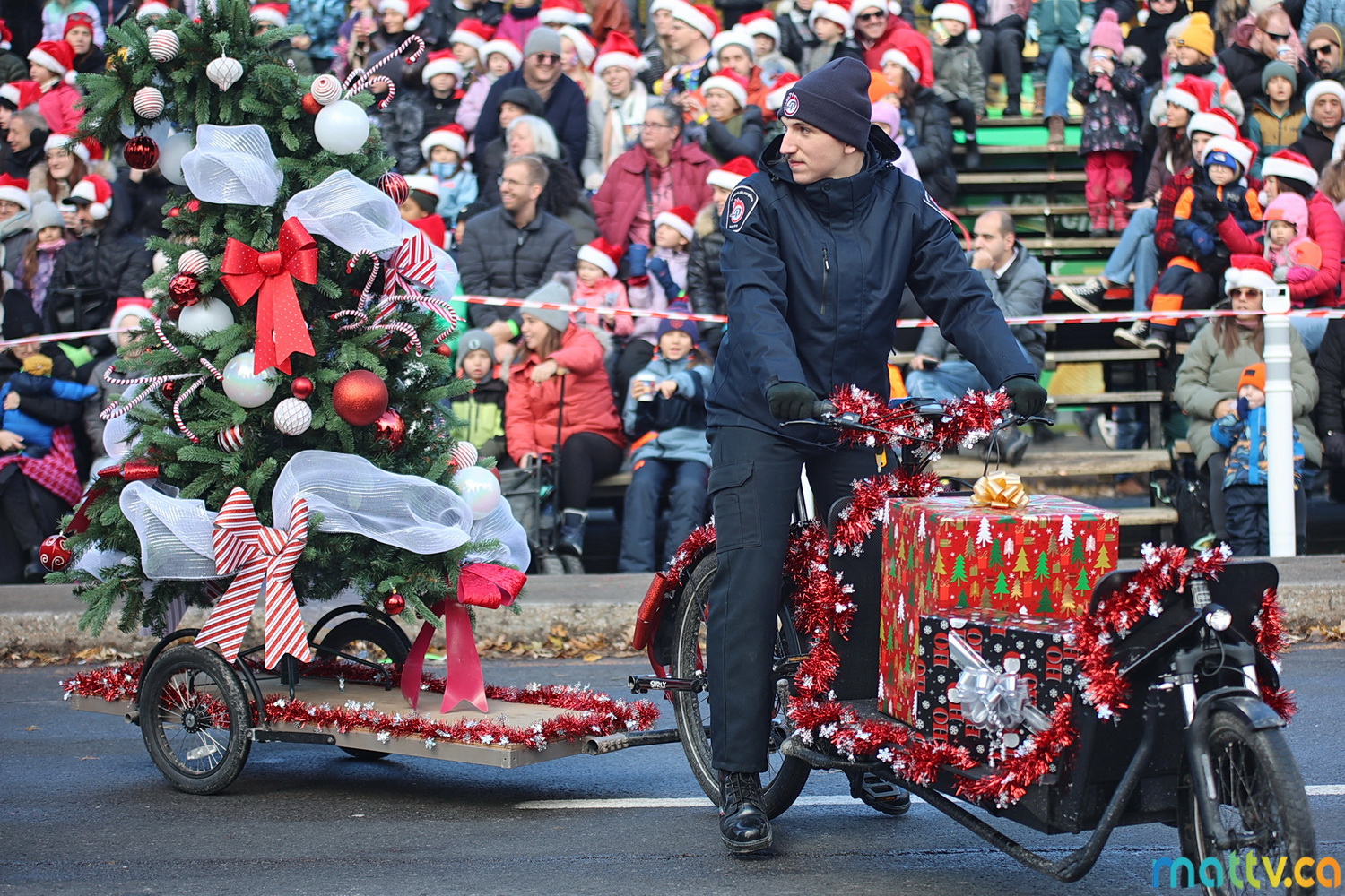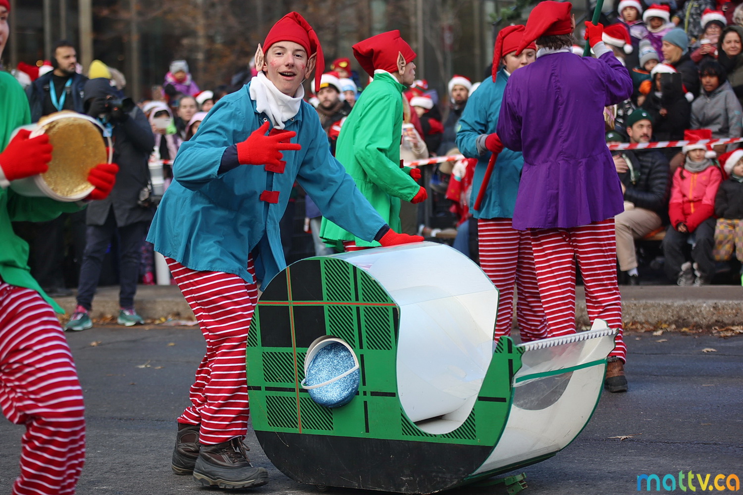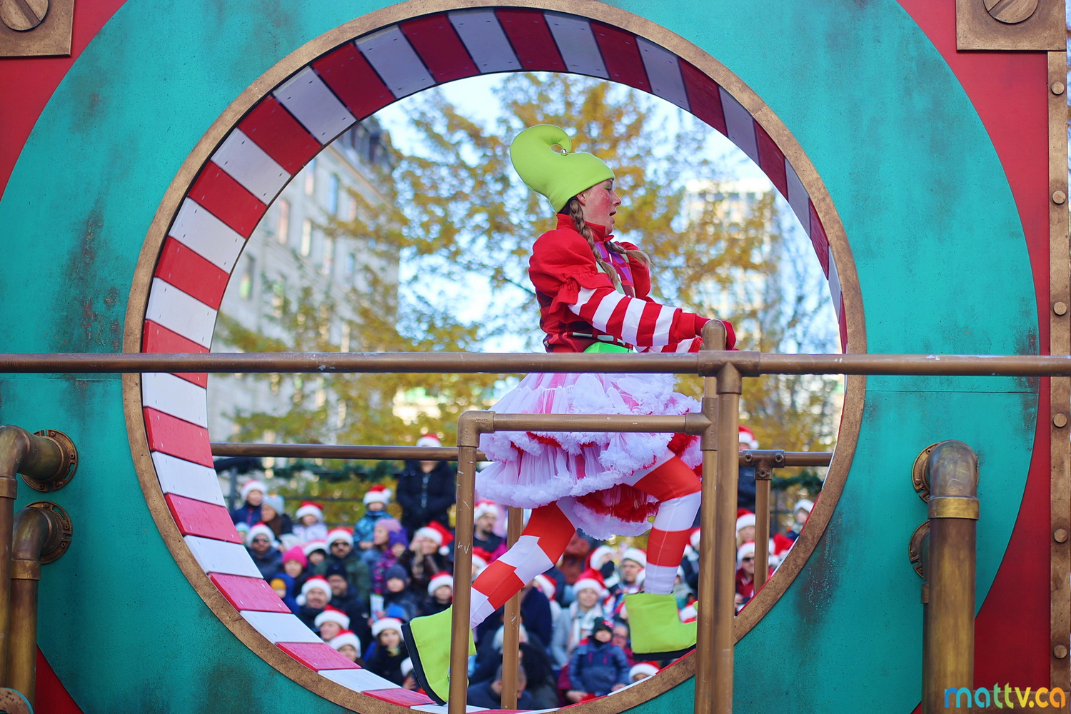 Dès notre arrivée, le centre-ville vibrait au rythme de la musique, des couleurs et de l’excitation générale. Un immense merci à Tim Hortons pour le chocolat chaud qui a ajouté une touche de réconfort, le parfait réconfort pour patienter avant le début des festivités ! et à Montréal centre-ville pour les chapeaux du Père Noël offerts.