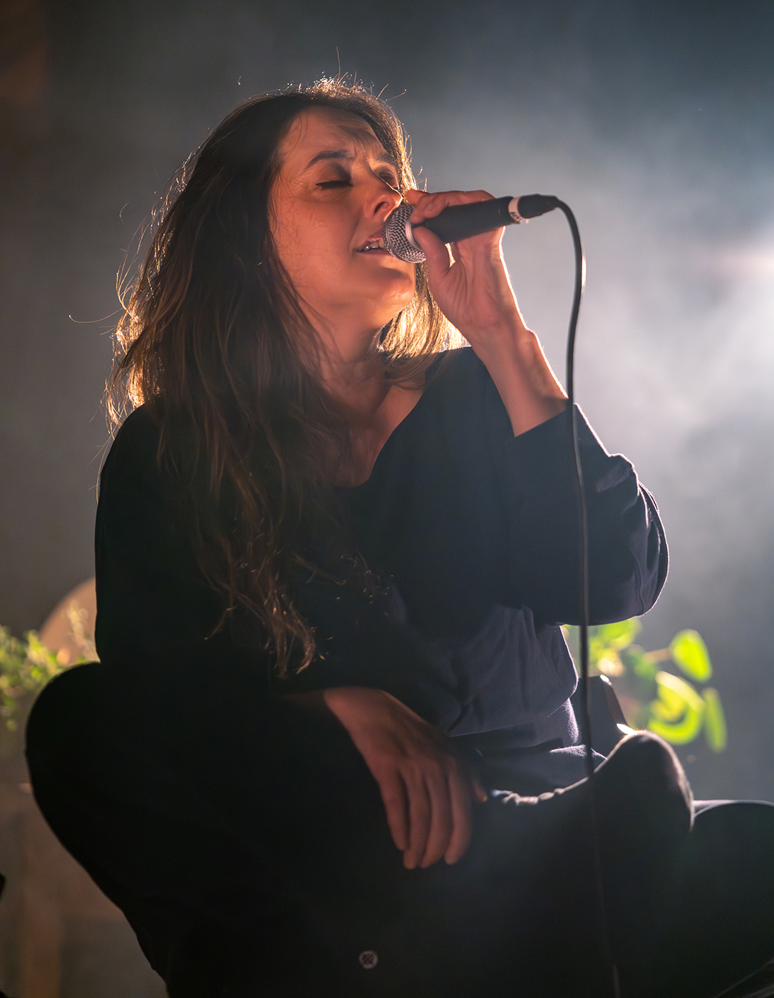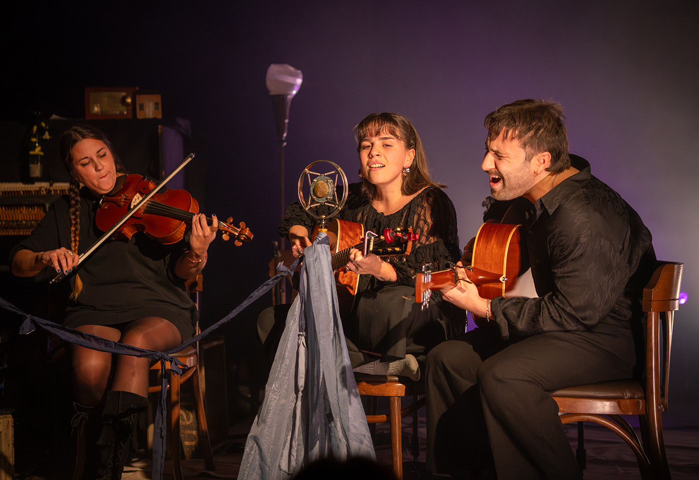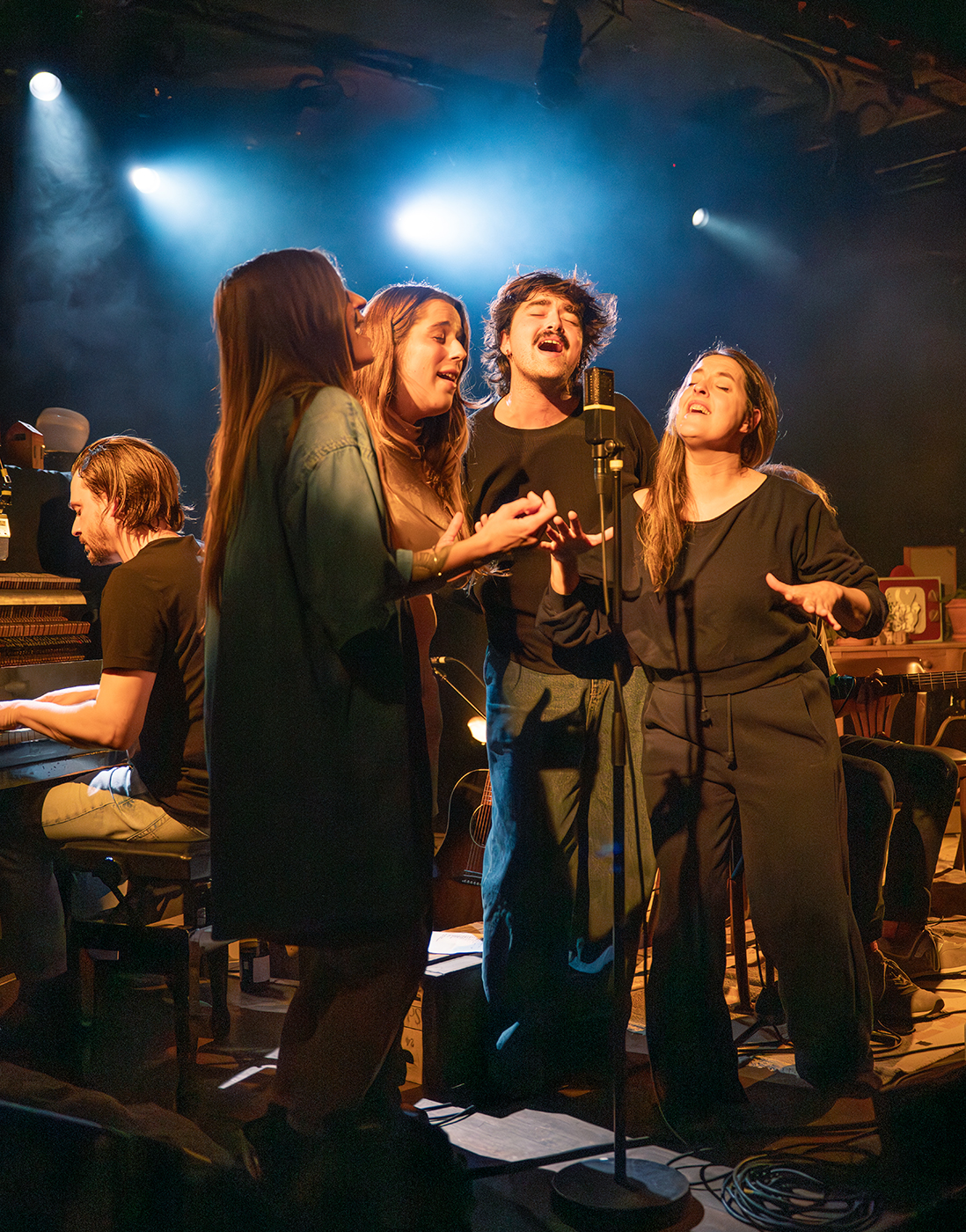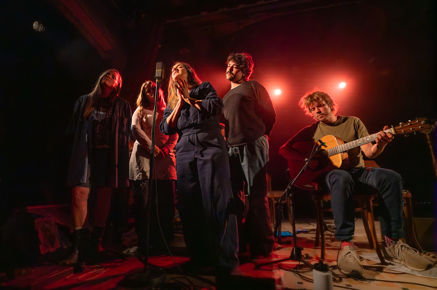 Ici pour présenter Album Bleu, sorti en 2024, et sa version Album bleu Deluxe, sortie en 2025, Marie-Pierre Arthur arrive sur scène avec pour nous, public, de nombreuses surprises. D’abord, l’artiste arrive dans ce que l’on pourrait penser être son salon. Jolies lampes, petites plantes, chaises en demi-cercle, lumières tamisées. Puis, à ses trousses voilà 3 autres chansonniers qui s’installent à ses côtés sur ces chaises: Naomie de Lorimier (N NAO), Raphaël Pépin-Tanguay (Velours Velours) et Émilie Pompa. Ce que l’on pensait être une prestation individuelle se transforme très rapidement en une joyeuse fête un peu désorganisée où l’on rencontre du bien beau monde. Alors, dans la charmante salle du Cabaret Lion d’Or, là où tout s’y prête bien, la chanteuse mène avec bravoure une danse à quatre, avec une sincérité et une honnêteté parfois déroutante. Les chœurs sont construits, harmonieux, on ne peut plus réussis. Le public est charmé, il faut dire que sa performance, les voix en chœurs qu’elle y ajoute, et bien sûr cette salle, s’y prêtent bien.