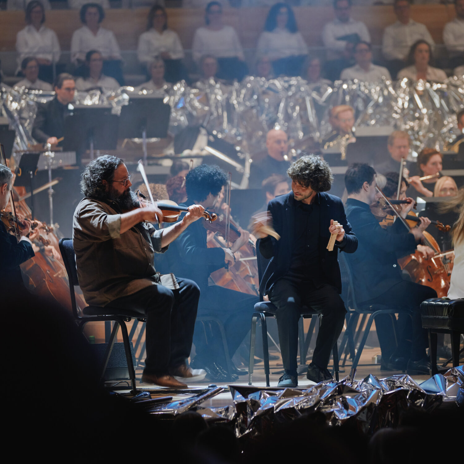 Le violoniste de musique trad, David Boulanger, s’est joint à l’orchestre pour le Petit concerto pour Carignan et orchestre que les spectateurs n’ont pu s’empêcher d’accompagner en frappant des mains. Il convient de noter que les éclairages ont contribué à l’ambiance festive.
