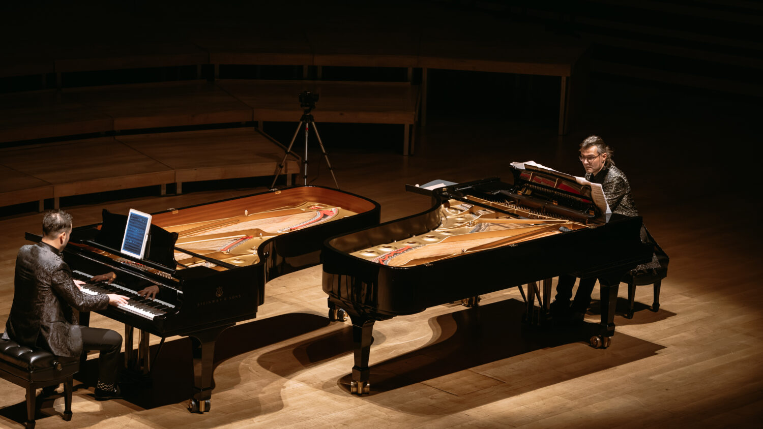 Les pianistes d’exception, Jean-Philippe Sylvestre et Serhiy Salov, arrivent en scène. Ils prennent le temps de s’adresser à nous en toute simplicité. Le ton des musiciens est parfait. Les pianistes nous expliquent tour à tour des œuvres que nous connaissons souvent déjà. Il est toujours utile de tendre l’oreille vers des particularités mises de l’avant par les pianistes.