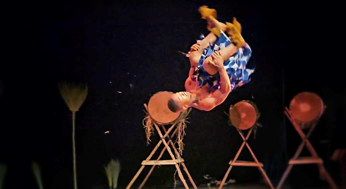 Les acrobates de World of Words sont à la fois musiciens et danseurs  tout en ayant les habilités pour nous ébahir par leur force, leur agilité et leur souplesse. Il ne semble y avoir aucune limite au sens dans lesquels les contorsionnistes peuvent se tortiller. Ils sont impressionnants de même que tous les artistes qu’ils se déplacent en dansant ou en sautant à des hauteurs spectaculaires par leur seule force musculaire. Les acrobaties aériennes sans filet, sans accroche de sécurité, fascinent toujours autant. J’aimerais quand même qu’ils fassent tous un peu attention à la paille au sol sur laquelle je craignais qu’ils dérapent. Ils sont solides et magnifiques tout à la fois.